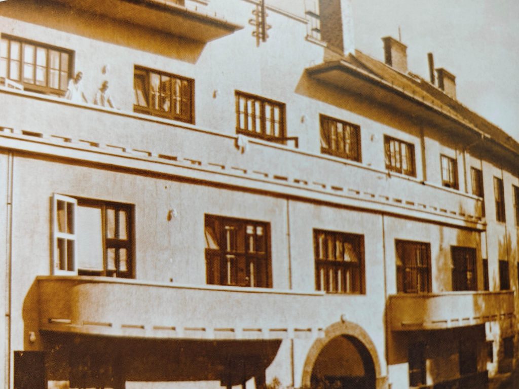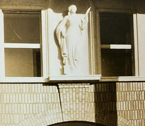 Szent Borbála, a bányászok védőszentjének szobra állt az építéskor a Kórház homlokzati fülkéjében