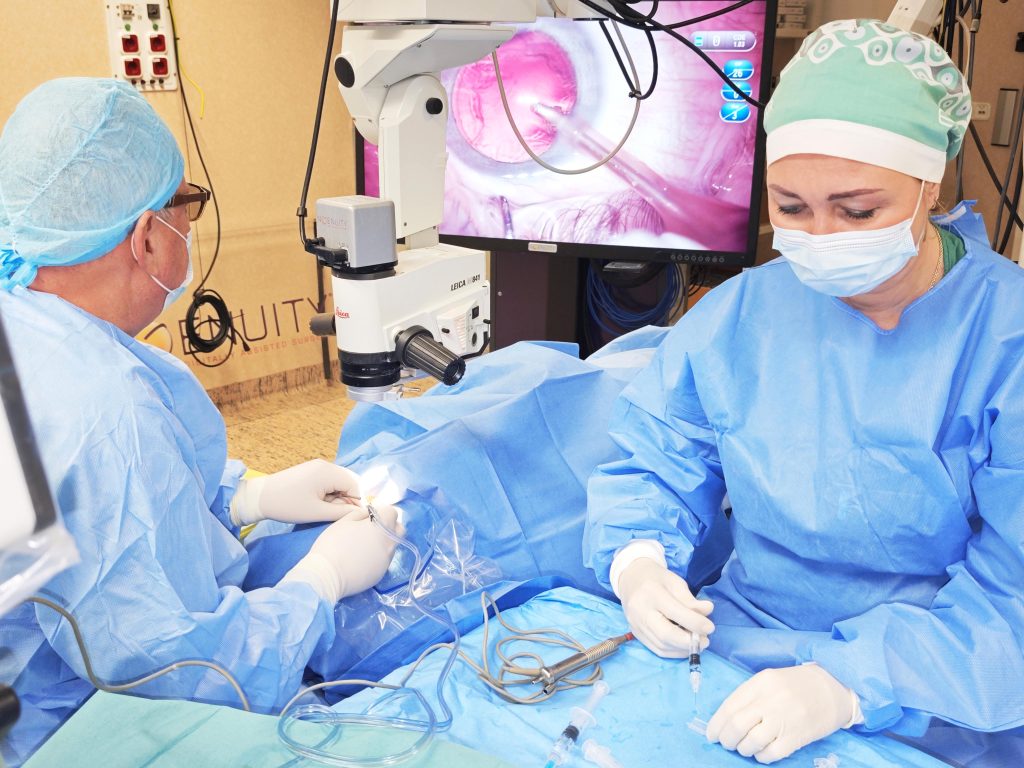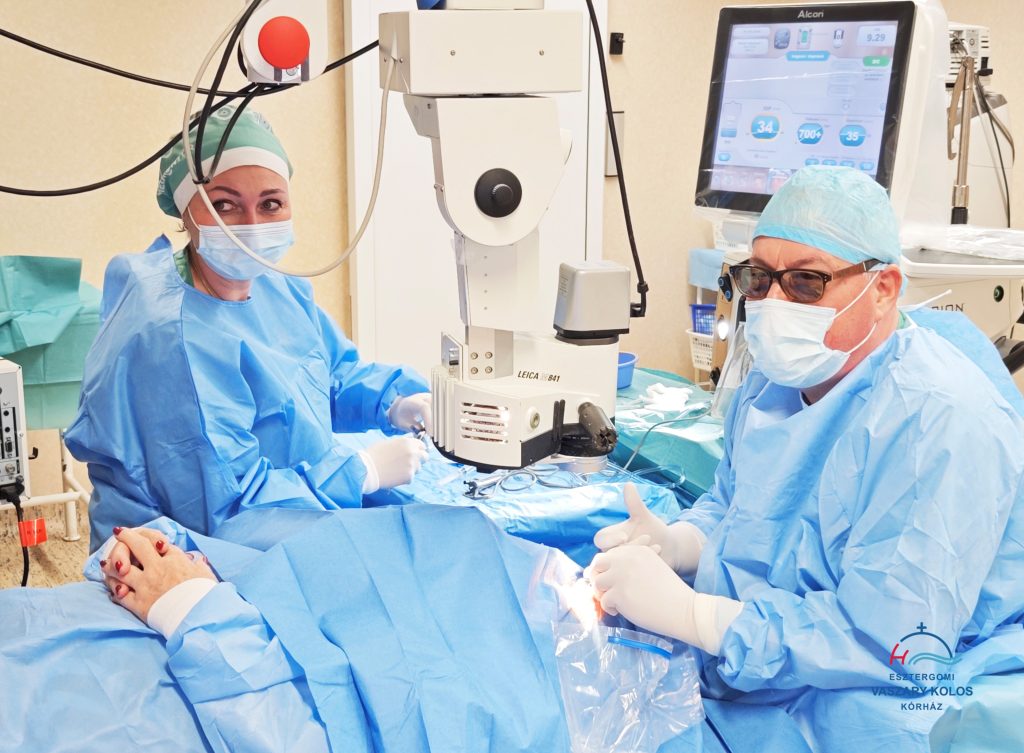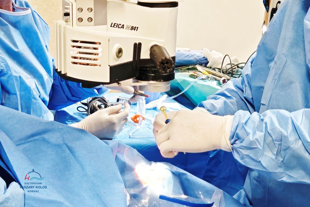Az operációk során a legkorszerűbb eszközöket használjuk az Esztergomi Vaszary Kolos Kórházban. Már nem egy mikroszkóp optikájába nézünk bele a mikrosebészeti műtét során, hanem digitális kamera készít el egy nagyon nagy felbontású, teljesen éles, kontrasztos képet a szemről. Az elkészült képet kivetíti nekünk egy 3D monitorra, ahol az orvosok a szem kinagyított, részletes képét egy speciális polárszűrős szemüvegen keresztül látják. Az operáció során ha például műlencsét kell tengelybe tenni, akkor a gép bevetíti nekünk a szemre, hogy hova tegyük a tengelyt, hova készítsük a sebeket és az mekkora legyen.